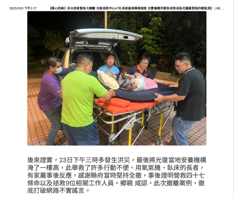 1141016暖心防線!洪水前夜縣府大撤離 光復長照中心47名長者脫險 新聞報導