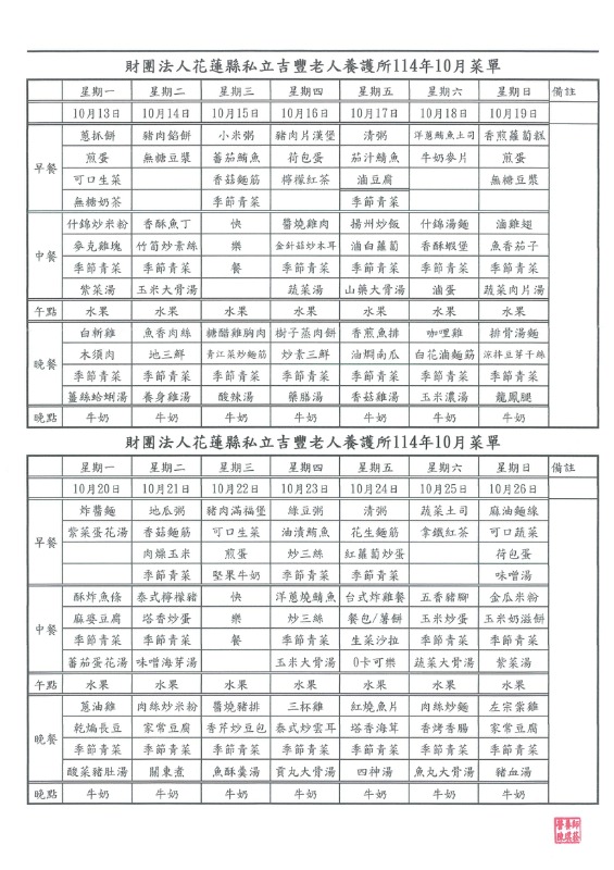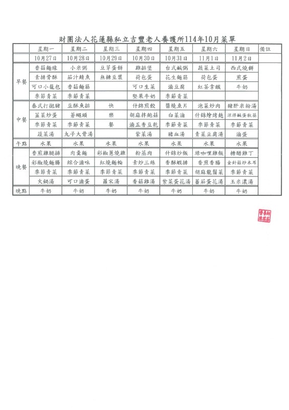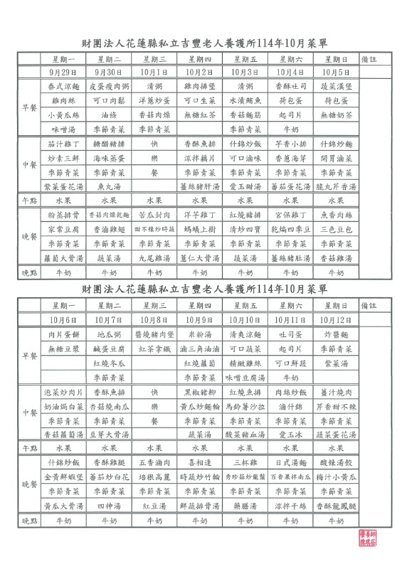 10月份菜單簡介 為了讓每位長者都能吃得健康又開心,本養護所的十月份菜單由營養師精心設計,兼顧 營養均衡、口感多樣與長者需求。每日提供早餐、中餐、晚餐及點心,選用當季新鮮食材,以清淡少油、營養豐富為原則,確保餐餐安心、美味又健康。 菜色包含中式家常菜、西式變化料理與溫暖湯品,搭配水果與牛奶補充能量與蛋白質。希望透過每日的用心備餐,讓長者在品嚐美味的同時,也感受到家的溫暖與照顧的關懷。