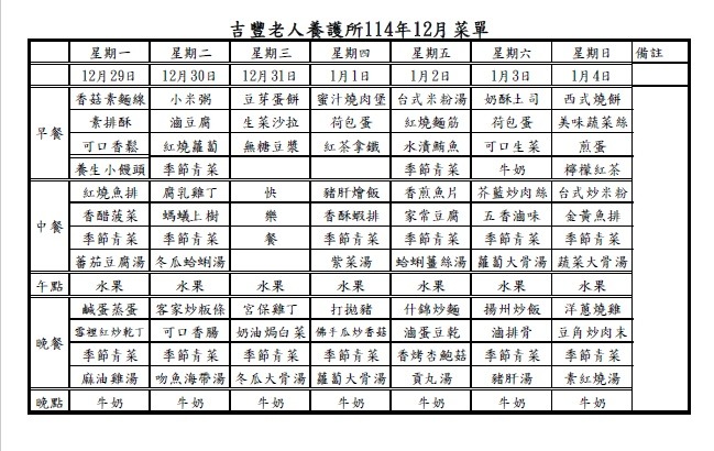 古豐養護所114年12月份菜單新鮮出爐啦! 每一天都是「美味小驚喜」!從香噴噴的早餐到溫暖的晚餐,還有甜甜的下午點心,讓我們的長輩們吃得開心、吃得健康! 本月亮點: ✅ 經典家常菜溫暖心 ✅ 豐富蔬菜營養滿分 ✅ 牛奶、水果天天有,健康加分! 快來看看一月的美味行程表 (附上菜單圖片) 讓我們一起期待每一天的幸福滋味吧! #古豐養護所 #一月菜單 #健康美味 #幸福每一天