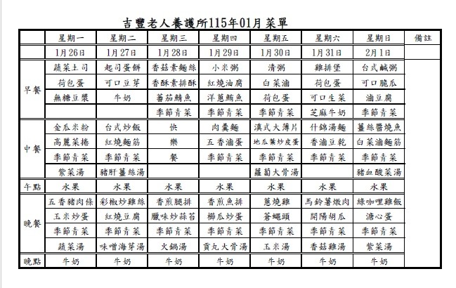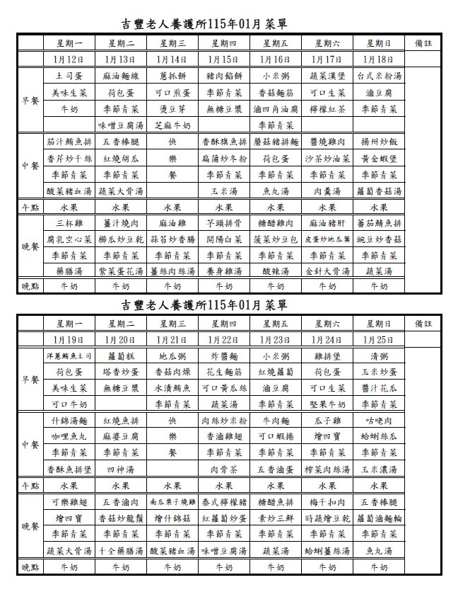 親愛的家屬與朋友們,以下是本養護所 115 年 1 月的餐點安排,讓大家了解長輩們的每日飲食內容,確保營養均衡、健康美味! 菜單期間:115年1月1日~1月31日 每日提供:早餐、午餐、下午點心、晚餐及晚點 詳細菜單請參考下方圖片: (附上您提供的菜單圖片)