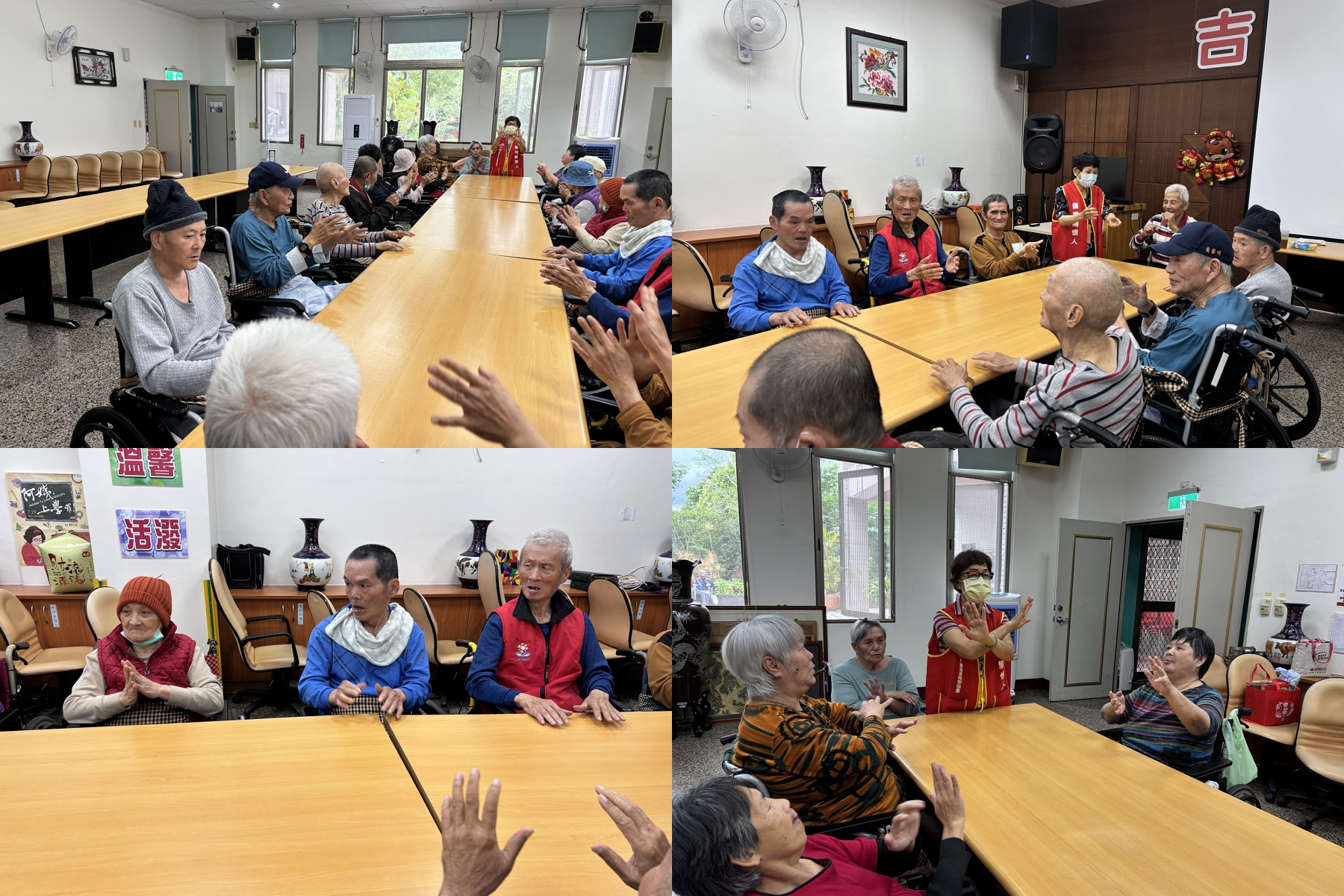 在室內活動空間中,多位長輩圍坐於長桌旁,由倡導人站在一側帶領動作示範。長輩們依照引導,雙手跟著節奏進行拍手與手部律動練習。整體座位呈現環狀配置,有助於彼此互動與觀察。牆面張貼著活動標語與裝飾,營造出溫暖且有組織的學習環境,展現透過倡導人引導,促進長輩參與團體活動與肢體運動的實際情形。